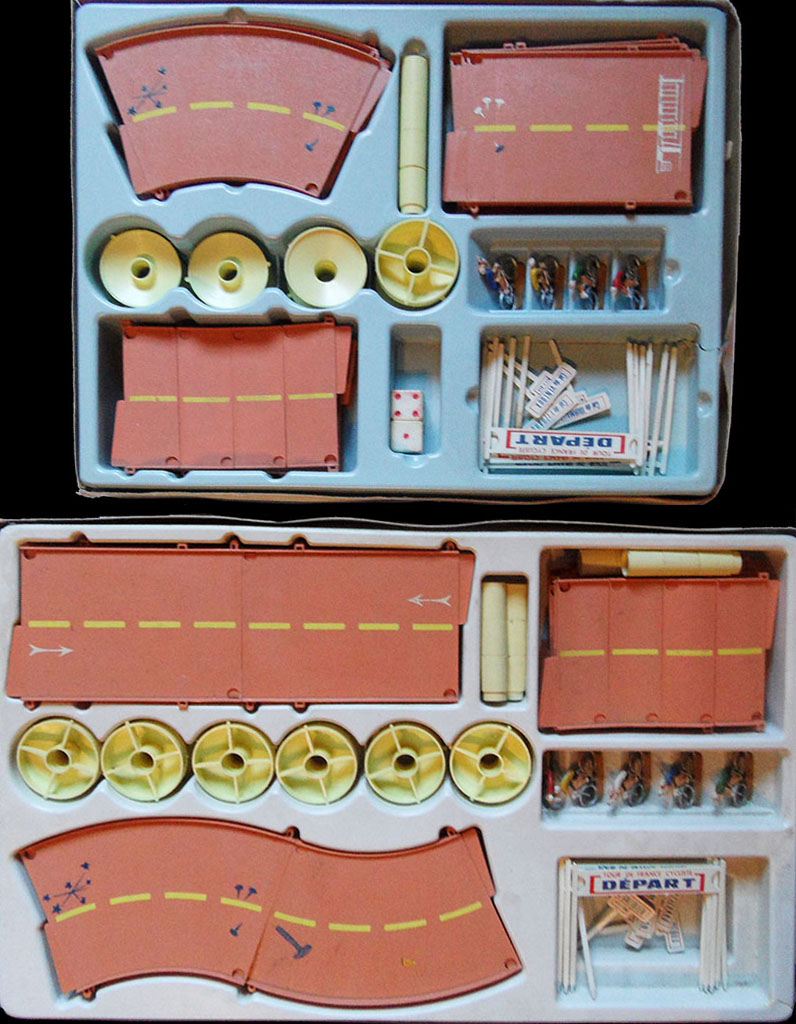 My friend Didier Maria has been kind enough to send me pictures of the contents of both boxes for comparison. According to Didier, this second box has two extra curves (which makes 10 in total), three extra straights (which makes 13, including the crosses), two extra sets of implements for the climbs, and one extra rider. As you can see in the picture above, there is no slot for the fifth rider in the box; it looks like this rider could have been added later.