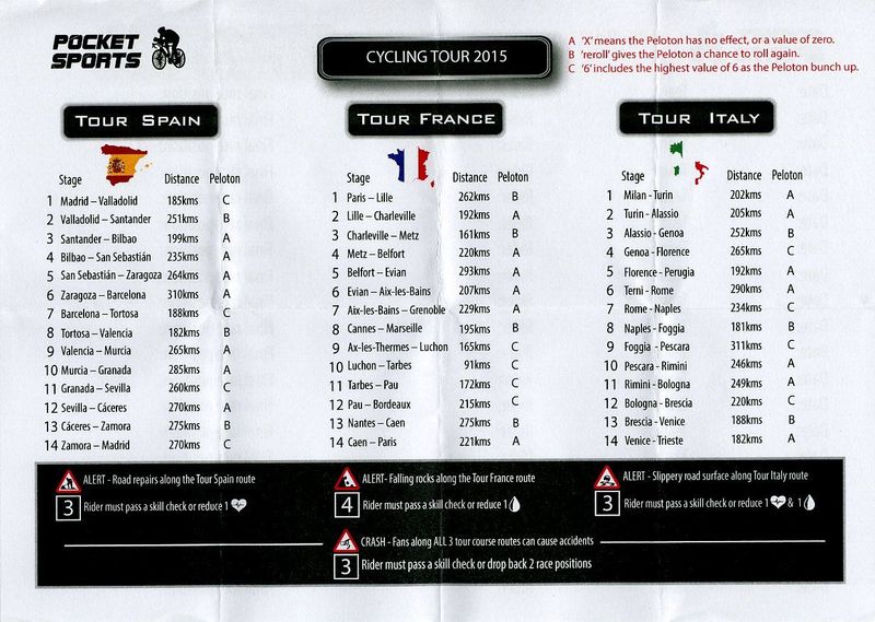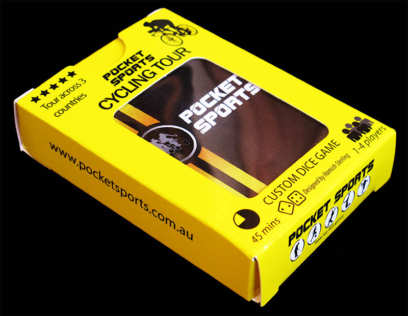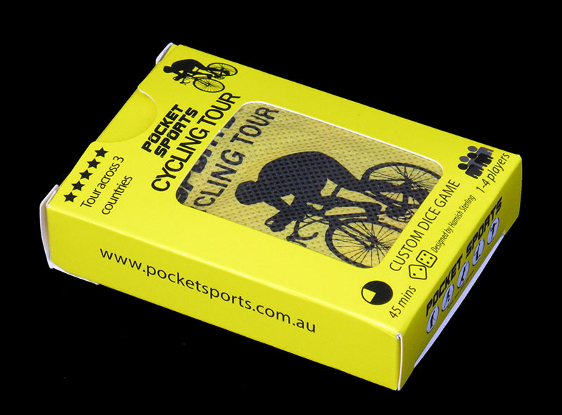 Small game from Australia belonging to a large collection of dice-based sports games devised by Hamish Sterling. According to Hamish himself, "Pocket Sports Cycling is a simple dice rolling game that lets you take the handlebars of a rider in a cycling event". This game, which can be played in solo mode or up to 4 players, is supposed to consist of a Grand Tour that takes place accross 3 different countries with 42 stages. But then Hamish is the first to concede that he is not a big cycling fan. As I see it, this game represents a three-stage race with a short time-trial prologue. Seen this way, the game is almost realistic.