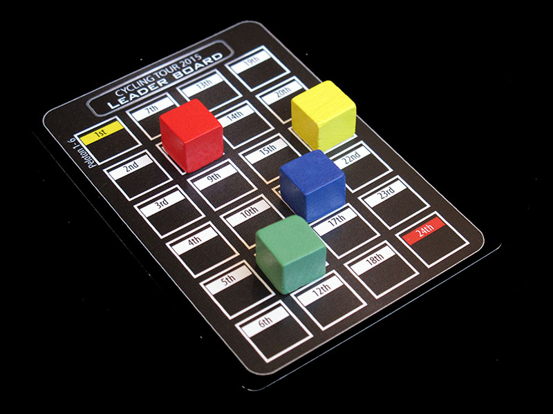 Inside the card-deck-sized box (it really fits in your pocket) you will find six different colour-coded dice, four team cards, a leader board, twelve wooden tokens, the rules and the list of stages. "Pocket Sports" honours its name.