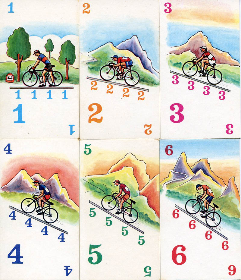 The game features cards numbered from 1 to 6. Each player receives 6 cards and the rest are placed face down forming a stack. On their turn, players play a card, advance the number shown, and then draw one card from the stack. This is so as long as they do not pass the STOP mark on the board. From this point on they do not draw more cards, having to reach the finish line with the cards already in their hand. A nice simple simulation of an exhausting climb!