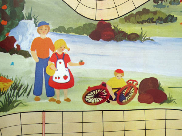 Riders stopping on one of the darker (yellow) fields must throw two dice and refer to a chance table in which numbers 8-12 are positive while numbers 2-6 are negative. (Translation: upon throwing 12 you reject a card -one you don't need-, advance three fields and you draw another card to complete your hand).