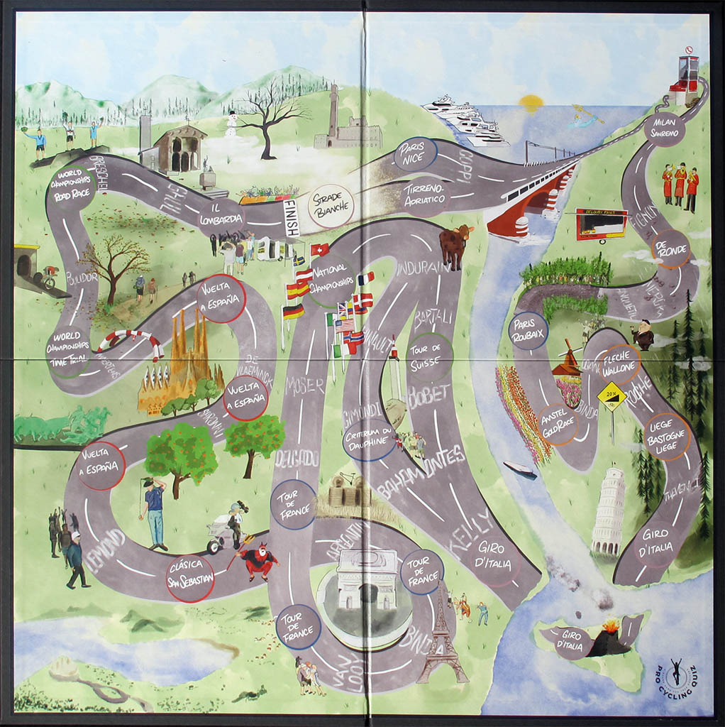 The open board measures 48x48 cm and represents a cycling season. The races are ordered chronologically, according to their order in the cycling calendar, and when two races are simultaneous (for instance, Paris-Nice and Tirreno-Adriatico) there are two paths that you can choose. On the other hand, the three-week tours have three fields each.