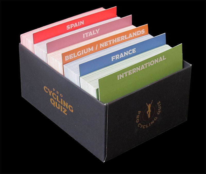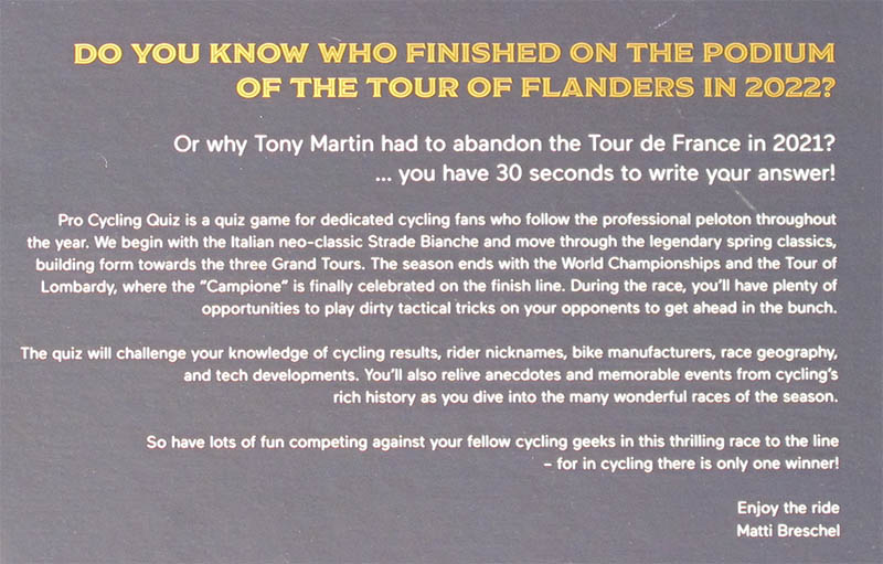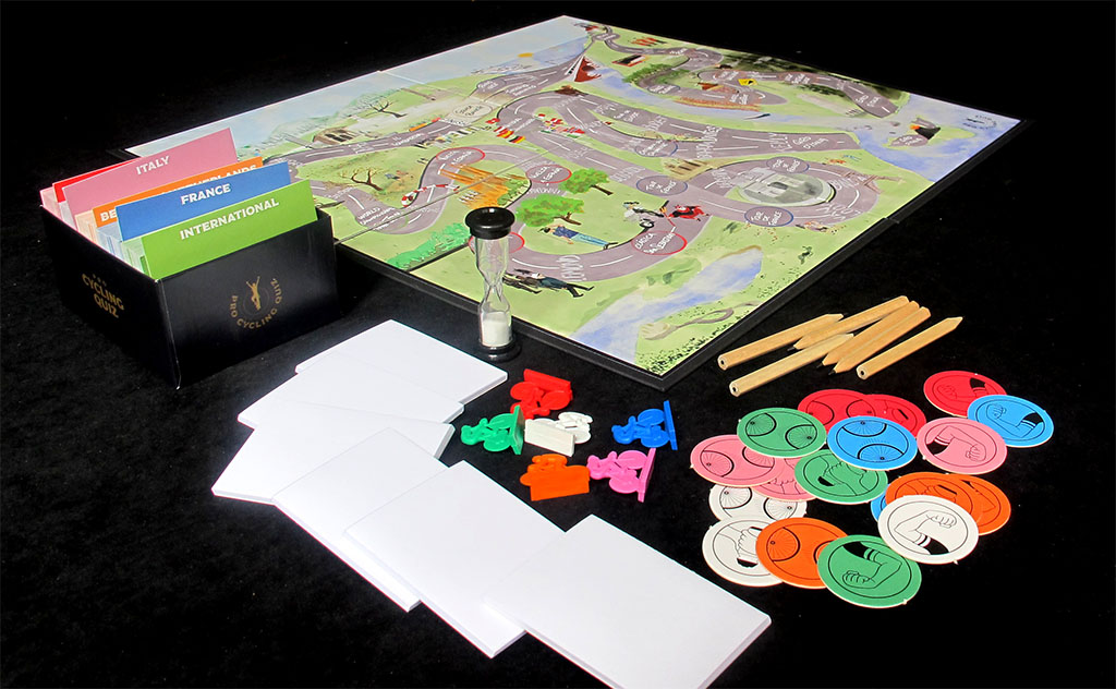 I have written many times that I do not particularly like quiz games. It is not that I profoundly dislike them (I have quite a few in my collection) but I am not attracted by them. Displaying who knows more about a particular subject is not my idea of a funny evening. This said, some of these games are better than others, and if I had to keep only one cycling quiz game, this Pro Cycling Quiz might be the one.