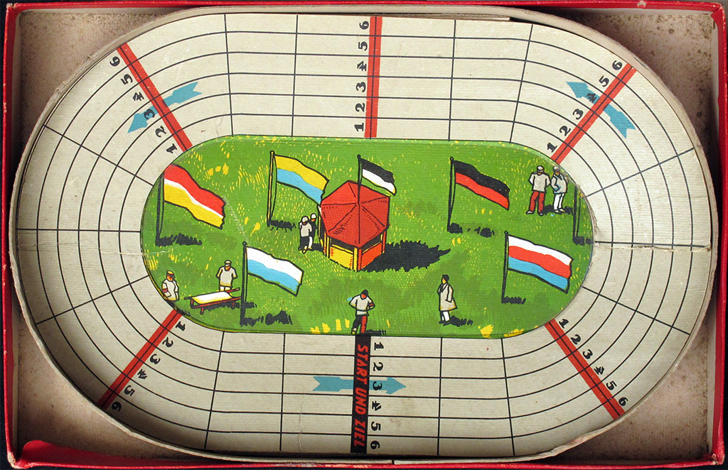Unusual German track cycling game of which, unfortunately, I do not have the rules nor much information about the game or about the game's maker. I admit I am not even sure if the fifth letter of the prominently featured makers name is an "n" (coud be an "r"?). For that matter, I am not even sure if that is the maker's name.