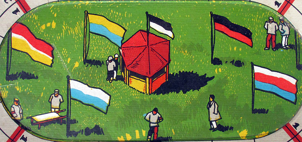 However, the flags displayed in this game may allow us to date it more accurately: on the box top we see two different flags (one of them twice). This flag that we see twice is the tricolour Imperial (Second Reich) flag, used until 1918, and briefly recovered as national flag between 1933 and 1935. The second flag (same colours, different order, white below) looks like the flag of the city of Berlin used between 1861 and 1912. (More on flags below).