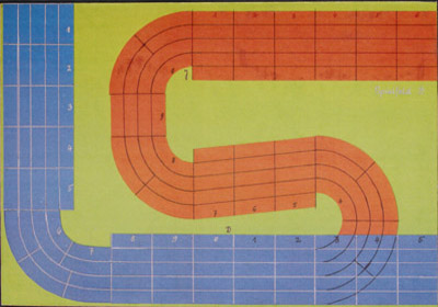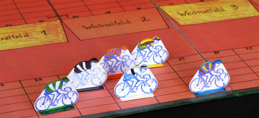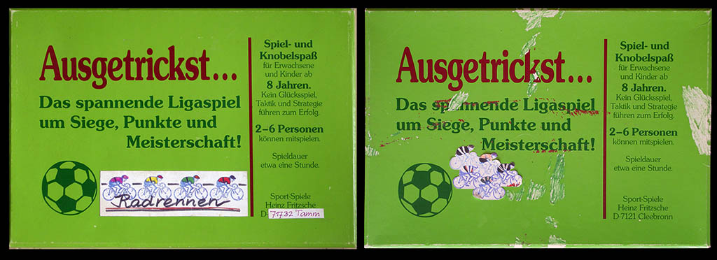 Unpublished prototype found by my friend François Cardinet at the Essen game fair, inside the box of a football game called "Ausgetrickst...", with which it shares some elements. It is a quite elaborate and complex game which I have not studied in depth yet. It features rules for both road and track cycling, and four double sided boards to design different races,