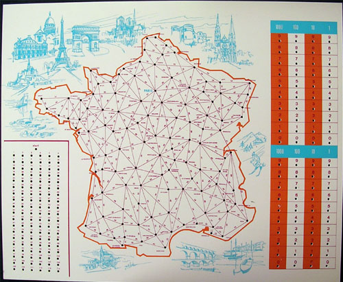 Note that the cyclists in these pics are not in an actual playing position (there should be one on each board, and the board should be dotted with pins). Since we are in the "nasty remarks" part, note also that the colour of the board is not faithfully represented in the pictures. The real color is somewhat orange... er, pink... er, kind of salmon color.
