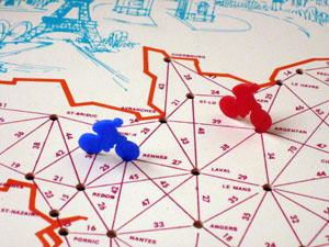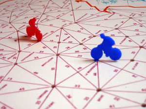 This is a nice educational game about geography, but in no way does it represent a cycling race. 2 players (that's what the "2" on the side of the box means: there is a version for 4 players) try to get from one city to another by the shortest way. In fact, they race each other, but on different boards. Each player has its own board.