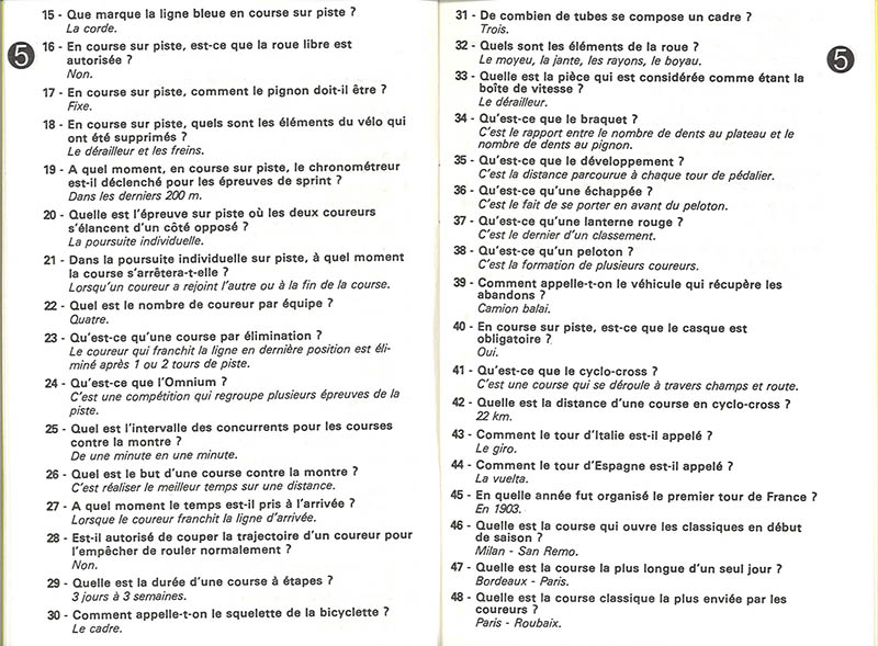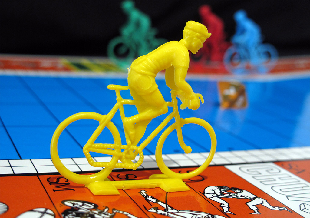 This game is hard to describe as "a cycling game", It is a sports quiz game, in which cycling is just one of the 64 (!) sports included. If I have included it in the collection is because it has cyclist-shaped figurines, and therefore it may look like a cycling game at first sight. However, the cyclists are not really racing each other (this is left for the swimmer tokens, the game is rather a swimming race game) but only determine the type of question you are going to be asked.