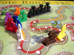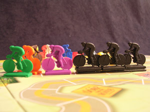 The most interesting (at least, unusual) rule is the presence of a peloton. It consists of three riders glued together on a small plate (see pics). This peloton generally moves automatically (following the last cyclist in the race) but can accelerate by playing some tactical cards (riders in front of the peloton also speed up), or overtake cyclists who had to skip one turn. If a rider is overtaken by the pack, he is in trouble..