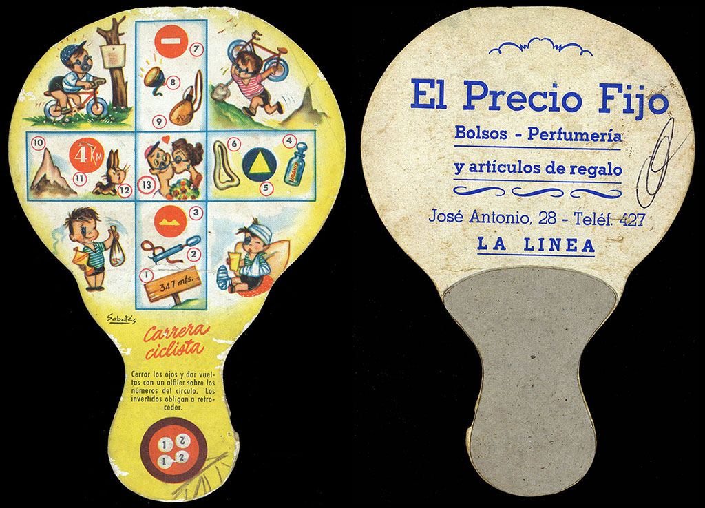 This rare children's game is printed on a small (17 x 12 cms) paper fan, a promotional item for a store in La Línea de la Concepción. By the way, these oriental-style rigid fans with a handle are called "paipay" (or "paipái") in Spain.