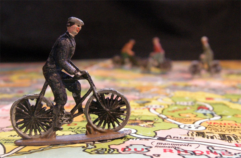 Actually, we have two games in one. In the early editions, both of them were cycling games; one of the games became a car rally over time. The early versions of the rules, which were printed on the game board, are quite simple. (Later versions are also simple, though longer, and were found on the back of the box lid). The rules of the first game are not those of a sports cycling race, but rather a bicycle travel through France, where riders stop to eat and drink local products.