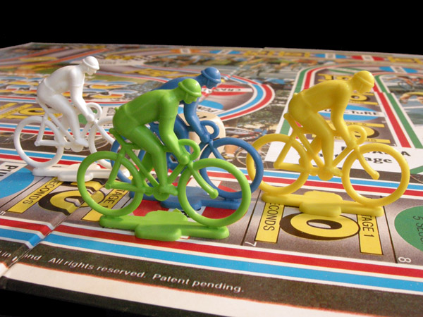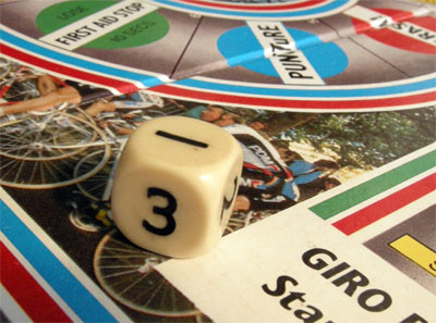 However, when a rider falls in a puncture area, he must wait until he throws a one on the dice or chose to halve his accumulated score. Here is a little strategy. Moreover, punctures are worse for race leaders than for riders with low scores, who do not have much to lose. (Exception: riders with a score of zero must remain une turn in the puncture area if they fail to throw a one).