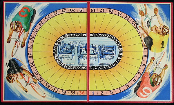 Daniela Merela remarked the race sheet was missing from my copy and gave me one of hers. As you can appreciate (or guess), there were a bunch of those included with the game, and they were stapled together. In case they are missing from your game too, you can use this one. By the way, you can see that the game really represents a six-day race (as opposed to just being named after one, as was often the case in the heyday of six days). One of these days I will have to make a special section with these games (and possibly rewrite all the descriptions too!)