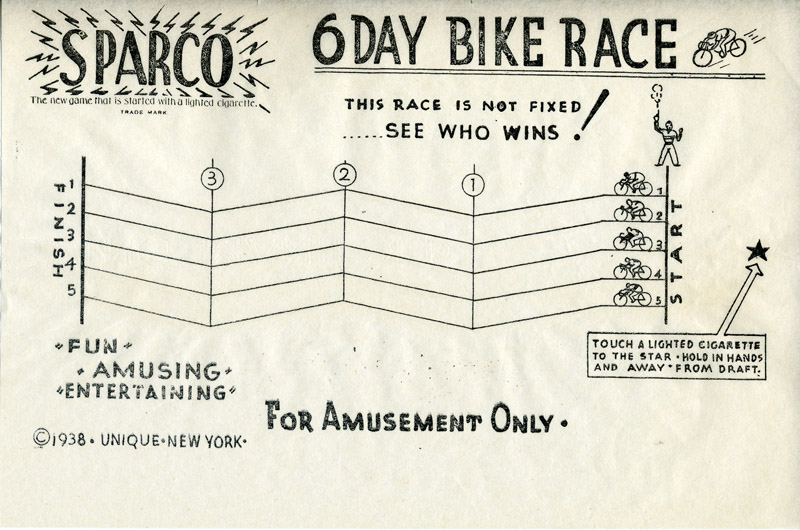 Strange as it is, this format (self-destructing games lit is found in different formats (and different subjects) in different countries countries. Whithout leaving the USA I can mention a couple of horse-racing cigarette-lit games: "Magic Race" (horses featured: Dead Indian, Anchor Man, Sun Marks, My Last Rry, Roman Request, and Sailor's Knot), and "Tom Thumb Race" (horses featured: War Admiral, Sea Biscuit, El Chico, and Stagehand). Both of them were made by The Lederer Co., NYC. The former has a "Buy U.S. war bonds" sign, so it is safe to assume that it was made sometime during WWII. The latter features three actual very famous pre-war horses (never heard of El Chico, nor of the six Magic Race horses).