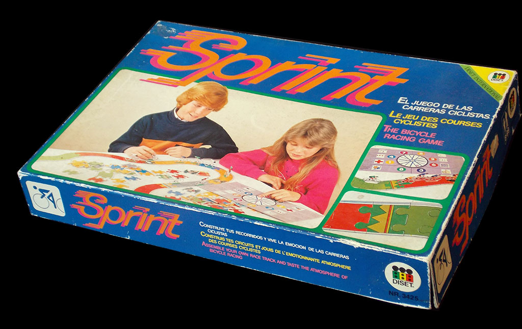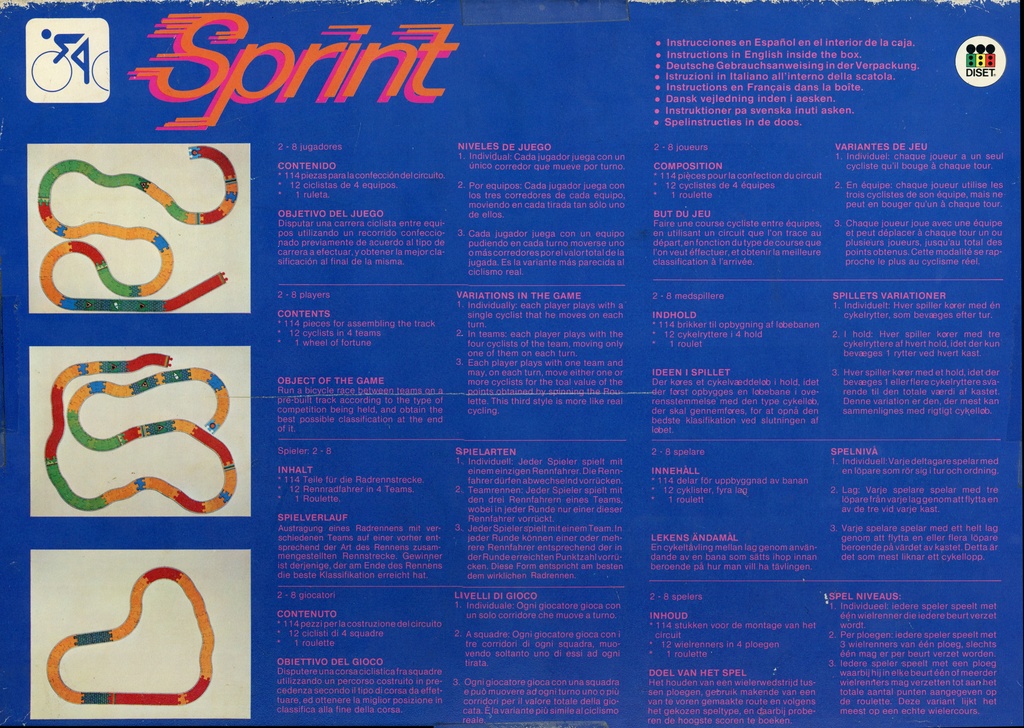 Sprint uses a spinner (called "wheel of fortune" in the rules) instead of dice. The spinner is numbered 1-8, and there are 8 possible race incidents as well (when riders fall on blue fields, you use the spinner to determine the race incidents). As you can see in the picture above, the race incidents are described in four languages (Spanish, English, Italian, and French) but the rules booklet is in 8 (!) languages, the other four languages being German, Dutch, Danish, and Swedish.