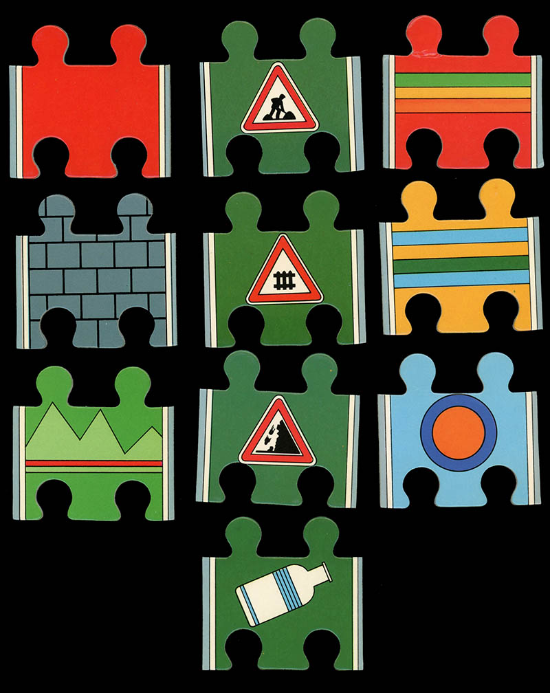 So far, so good (except that the number of pieces is not the one mentioned in the rules). However, I have noticed something weird. As you can see in the picture above, there are two kind of curves: those that turn to the right (upper line) and those that turn to the red (bottom line). One would naturally expect to find the same number of each, and that is what we find with the red, green, and blue curves. However, in the four different boxes of the game I have had the pleasure of counting, there were 20 red-turn yellow curves and 22 left-turn yellow curves.