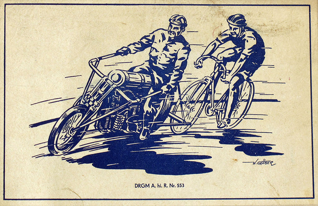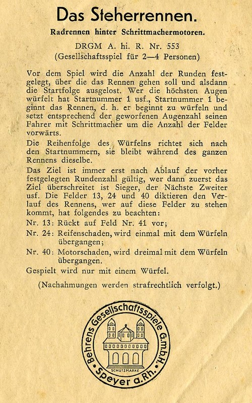 The name of the game is not featured on the box, but on the rules' sheet. The game box just features a fantastic drawing signed by W.Gräber. It depicts an old derny and an old bicyle, but I do not dare to say how old. Motor-paced bicycle races have been around for quite a long time. The world championships started in 1893 for amateurs and 1895 for professionals (Wikipedia). Not bad considering motorcycles are not much older. The internet is full of old pictures of old motor-paced bicycles (here or here, for instance) and I find it quite difficult to date this game just by the picture on the box. The motorcycle and the bicycle are certainly old, but I cannot tell how old. So take my estimation with a pinch of salt. The game might be older.