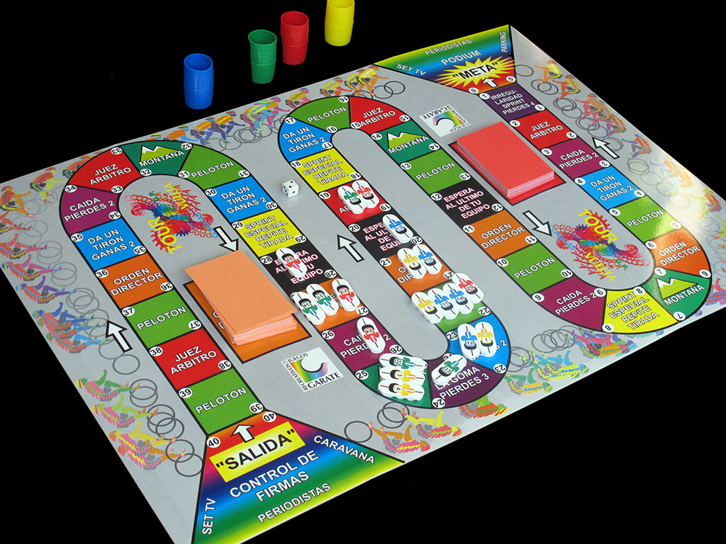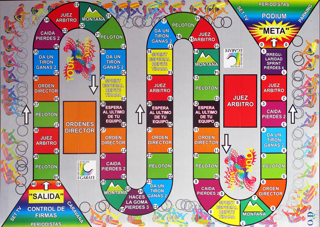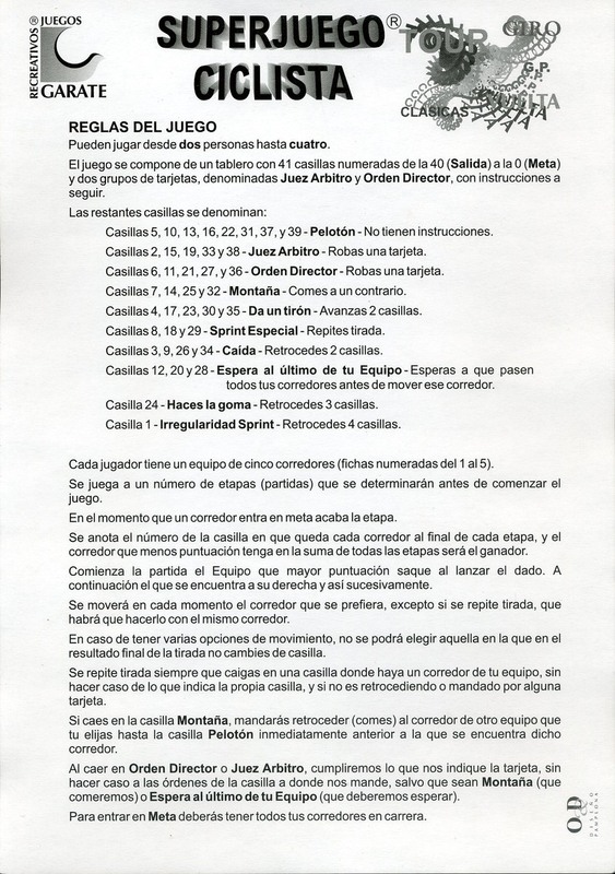 This is a little-distributed Spanish game, of which I am not even able to say the title. As you can see the box top just says "Tour Giro Clásicas Vuelta" while on the side and in the rules you can read "Superjuego Ciclista" (which just means "Cyclist Supergame"). As far as I am concerned, this is the title of the game.