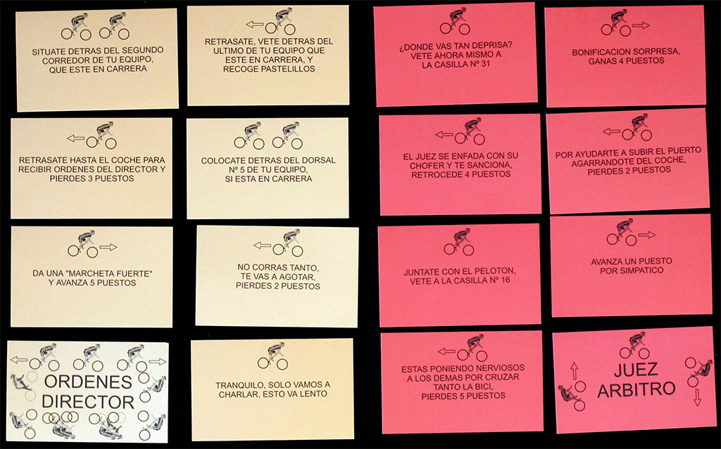 There are two different sets of chance cards, "Ordenes del director" (team manager's orders) and ("Juez Arbitro" (race director or referee). Both sets include good and bad cards, as you can see in the sample above,