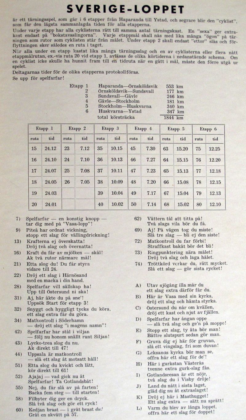 This game represents a six-stage Tour Of Sweden. Of course it is not the later Postgirot Open, which was held from 1982 to 2002, but the Sverigeloppet that was held between 1951 and 1965. I have not been able to find much information about this race, and most of it is is Swedish, but it was an amateur race that was very popular in Sweden. Probably the most well-known edition of the race was the first, in which 66-year old Gustaf Håkansson completed the race after being refused the inscription because of his age.