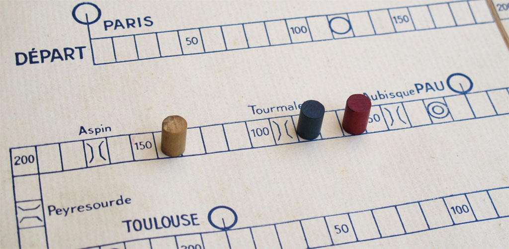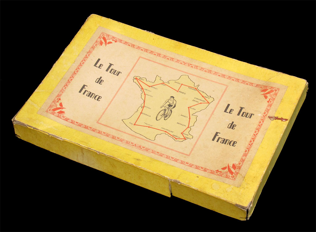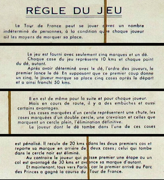 This is another old Tour de France game. Most Tour de France games can be dates as they feature the stages of a particular edition of the Tour, but this one does not. The general shape of this Tour with its 22 stages and the beginnin and end in Paris just hints that this game must be made somewhere between 1928 and 1950. The closest I have found is the Tour of 1939, which has exactly the same first 16 stages than this game, if you do not count split stages and a time trial in Monaco, but which was shorter. The last stages of the game do not match any Tour de France, specially the stage at Épinal, which was not ville-étape until 1954.