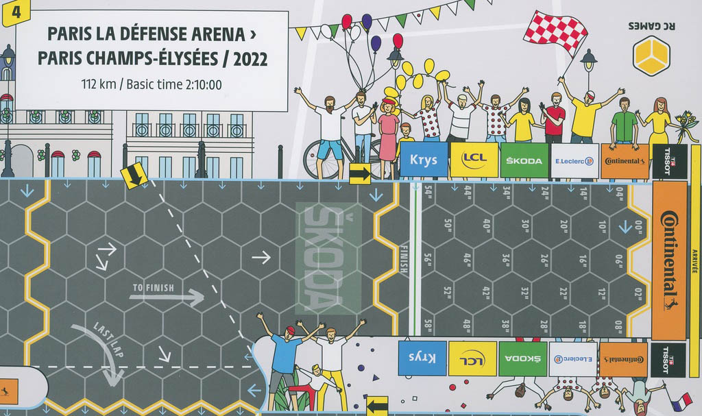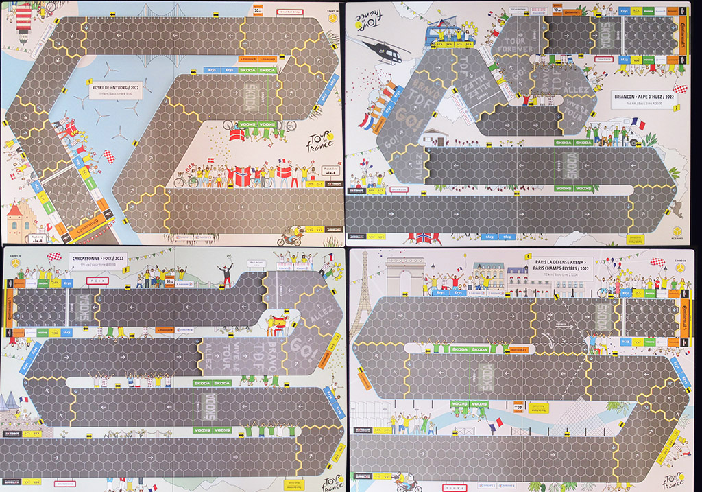 As the name of the game suggests, this game represents a stage race. Inside the box you find two reversible boards that feature four stages of the 2022 Tour de France: the second stage in Denmark, Carcassonne-Foix, the Alpe d'Huez, and the final stage on the Champs Élysées. That is, two flat stages, a hilly stage, and a stage with a mountain finish. They plan to gradually expand the game with additional stages. (Spoiler: the first addition will be 2023's TdF 1st stage in Bilbao). I am told that they also plan to release retro stages from the first editions of the TdF. Of course, at this stage of development of the game, you will have to play each board more than once if you want to play the complete Tour de France.