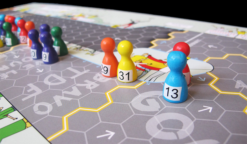 Up to six players can play this game, with each player managing a team of up to six cyclists. That makes quite a large peloton, though it is advisable to reduce the size of the teams if you play with four players or more. As you can see, we do not have cycling figurines, which is always a minus point in a cycling game. However, we have nice, warm, wooden pawns. I admit I quite like them after all. Don't forget that some of the most beautiful cycling games ever made have pawns too. Plus pawns are more stable than (most) cycling figurines.