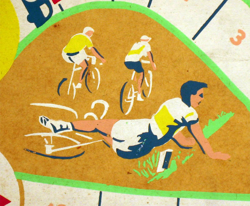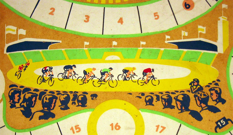 An additional rule is that when you get a throw of three dice with consecutive values (e.g.: 3, 4, 5) you move three riders accordingly plus you distribute the highest throw (in this case 5) between those three riders for an extra advance. This rule looks simple but turns out to be quite messy when actually played.