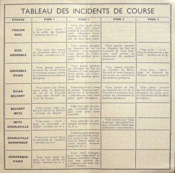 Each stage is exactly 7 fields long and has some dotted spots (on the France map) which represent incidents in the race (according to the table included, see below) for the rider who falls on them. However, these dotted spots have effect only once in each stage. That's why we have four small numbered red counters: whenever a rider falls on one of these spots, he choses at random one of the red counters and checks what is the effect (good ot bad). The counter is pt apart until the next stage. Some stages have less than four spots.