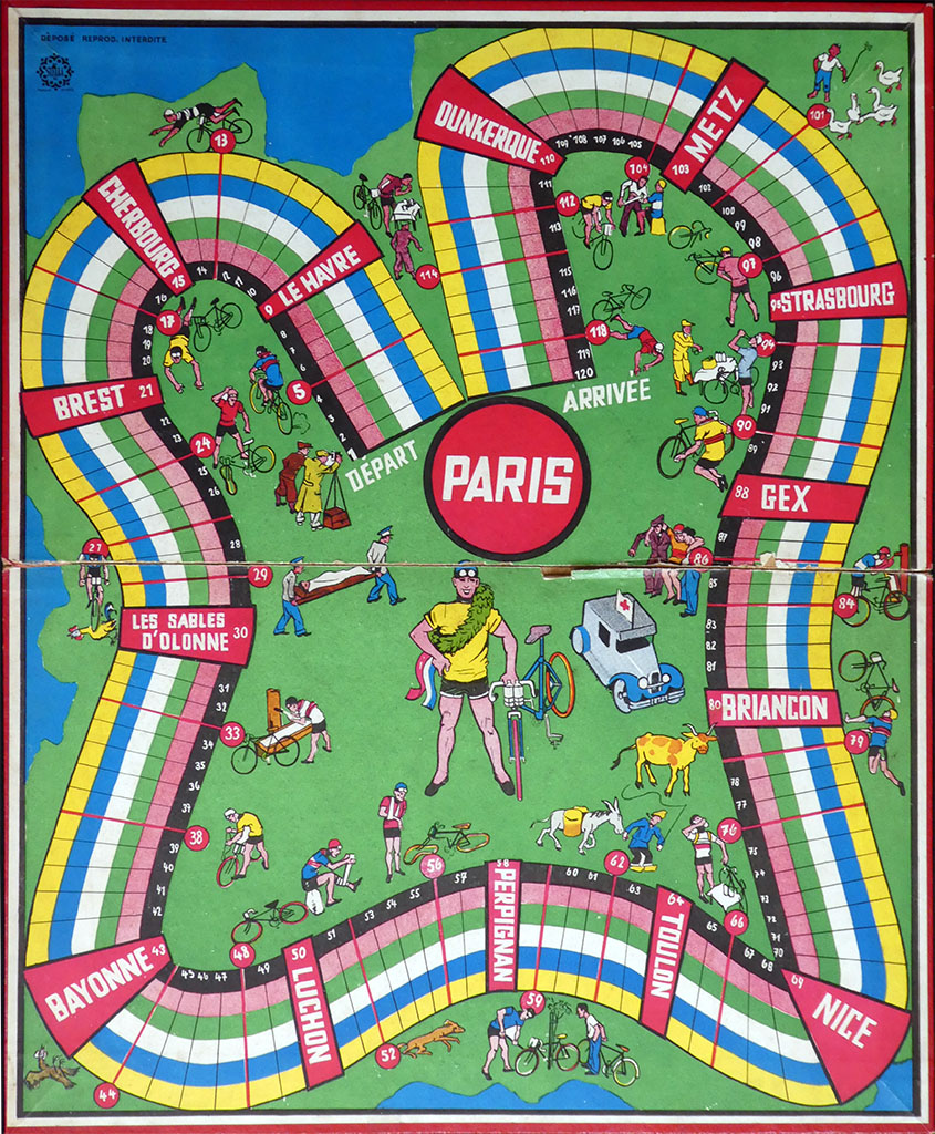 This is a game which I was not really sure if I had to treat as a version of this other game or as a different game. After some thought I decided that I would treat them as independent games. Of course, both games share the title (which is not really significant, since "Tour de France" is the most common name for a cycling game), the editor (why would someone publish two games with the same name?), and, most strikingly, both are based on the parcours of the Tour de France of 1924. Scroll down for a comparison of the two games.