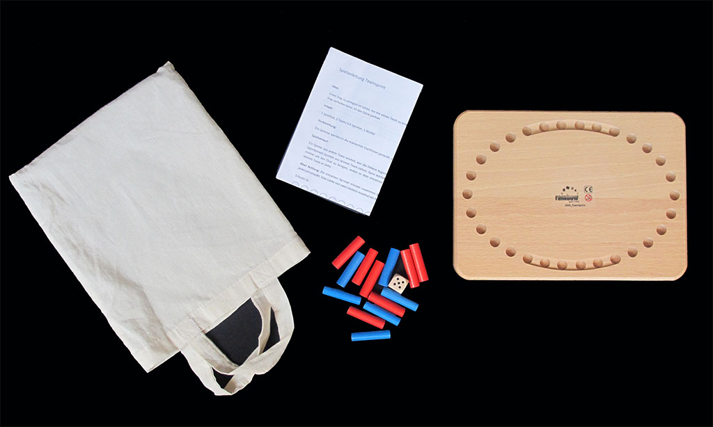 Here is a simple wooden game that does look quite unpromising at first sight. It includes what you see: a 24 x 17.5 x 2 cm wooden board with 30 holes, twelve wooden pegs in two colours (for some reason, there is an extra red "cyclist" in my game), a wooden die, and a printed sheet with simple rules in German, French, and English. Everything put in an unmarked simple cotton bag. The game is supposed to represent a team pursuit cycling race, but it does not (seem to) have a cycling feel: no cyclists, six riders per team (there should be just four if we try to represent a pursuit race, shouldn't there?), and very short rules that make it look like some kind of simple roll-and-move game.