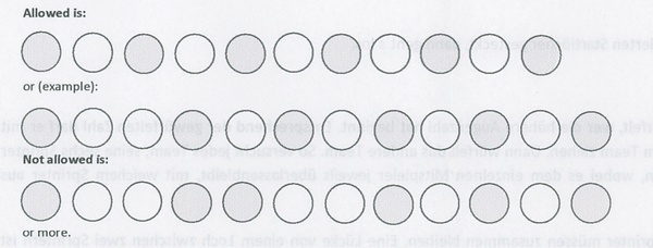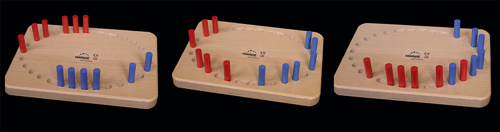 Here is the starting position. Teams have to complete a lap, and the winner is the first team to have its last rider past its starting position, unless the last rider is overtaken by the other team before completing the lap, in which case the race ends. As in real pursuit races, teams have to stay together. Basically, the only rule is that there cannot not be more than one unoccupied field between two members of the team, except once. And in that one case, there cannot be more than two fields. A team that cannot make a valid move in his turn just misses the throw. And that is all.
