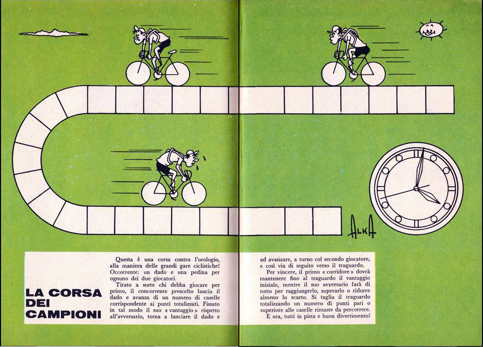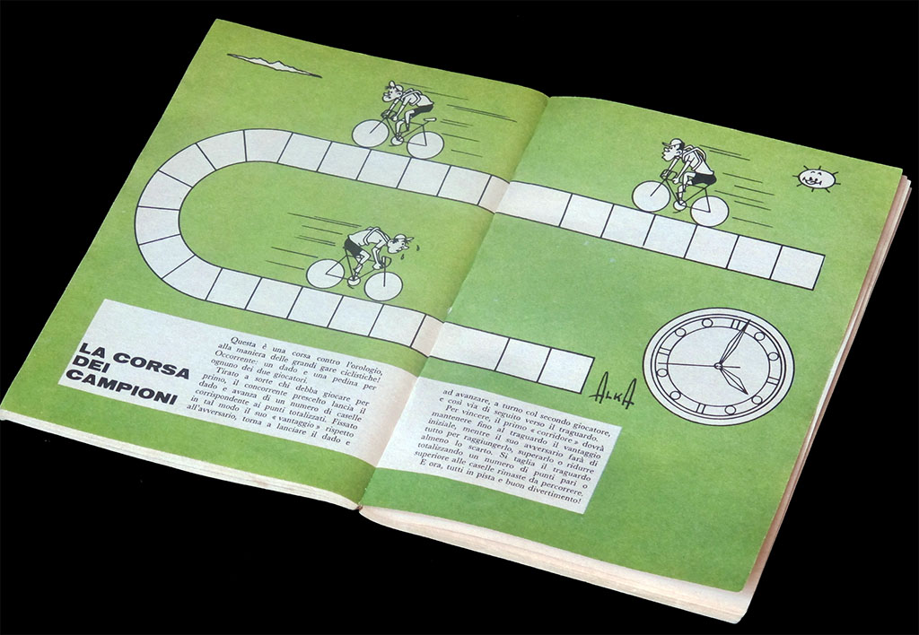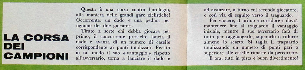 The name of the game, "Corsa dei Campioni", reminds somewhat of the famous time trial race Criterium des As. I have not found any indication that the Criterium des As was called Corsa dei Campioni in Italy (and there is an Italian game called "Criterium degli Assi"), but there is a similarity. If you realize that the Criterium des As was won for the first time by an Italian rider, Felice Gimondi, in 1968, it could be tempting to imagine that the game was dedicated to that win. However, it is just a coincidence: the actual race was run on October 13th, more than 6 months after this game was published.