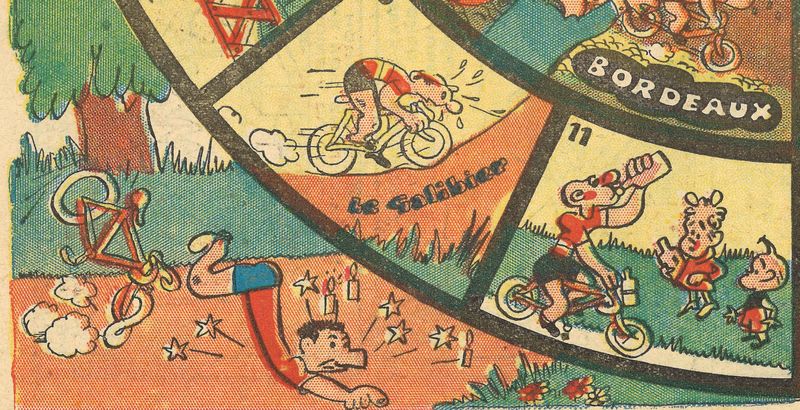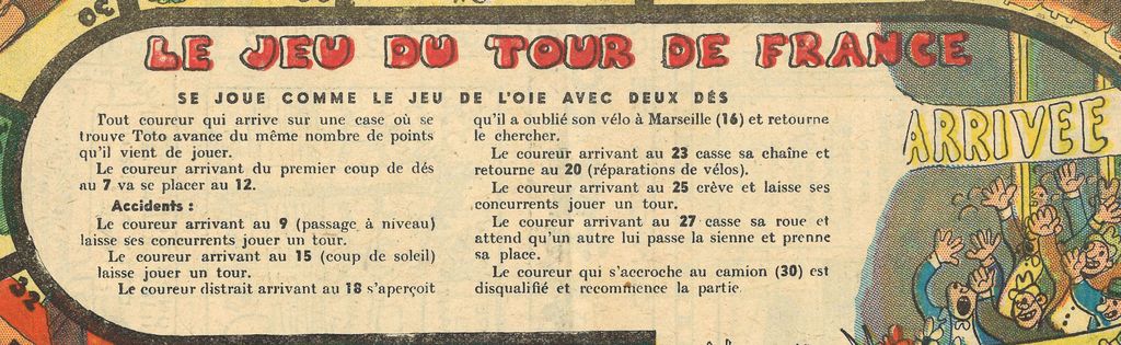 This game is found inside the July 1st issue of Le Journal de Toto. The magazine was not a long-lived one (it folded in May 1940 as the German army invaded France), but they had time to include at least another Tour de France game in December 1938.