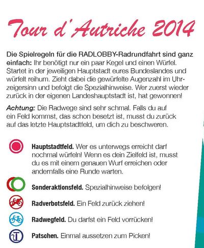 This is a free print-and-play game that I found browsing the net. Strangely enough, it has a French name (though we could also consider it is called "Radlobby-Radrundfahrt"). According to the pictures found in the Radlobby Österreich website it looks like the game was originally printed as a foldable poster (or leaflet) with information about the radlobby on the other side. (This information is also included in the downloadable PDF, see below).