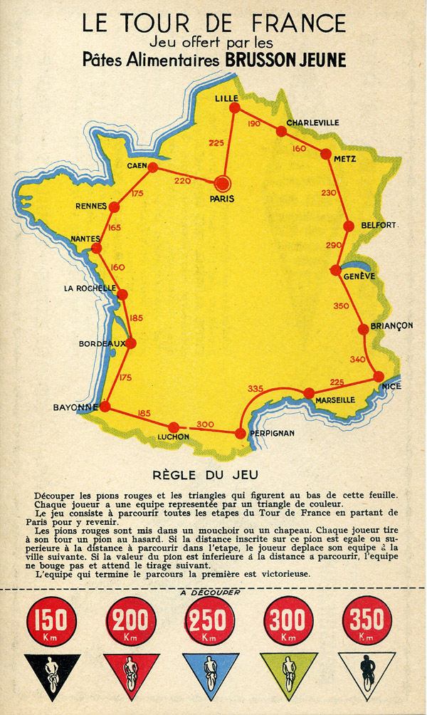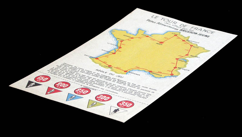 Small card (barely the size of a postcard) offered as a promotion for Pātes Brusson Jeune. I admit that when I first described this game some 15 years ago I did not think much about it, and I just dated the game as being "from the 1960s" without further research. As far as I can remember, I did not compare the stages in the game with any real Tour de France edition (I guess I started to do so later on), or I wondered who or what "Pātes Brusson Jeune" might be.