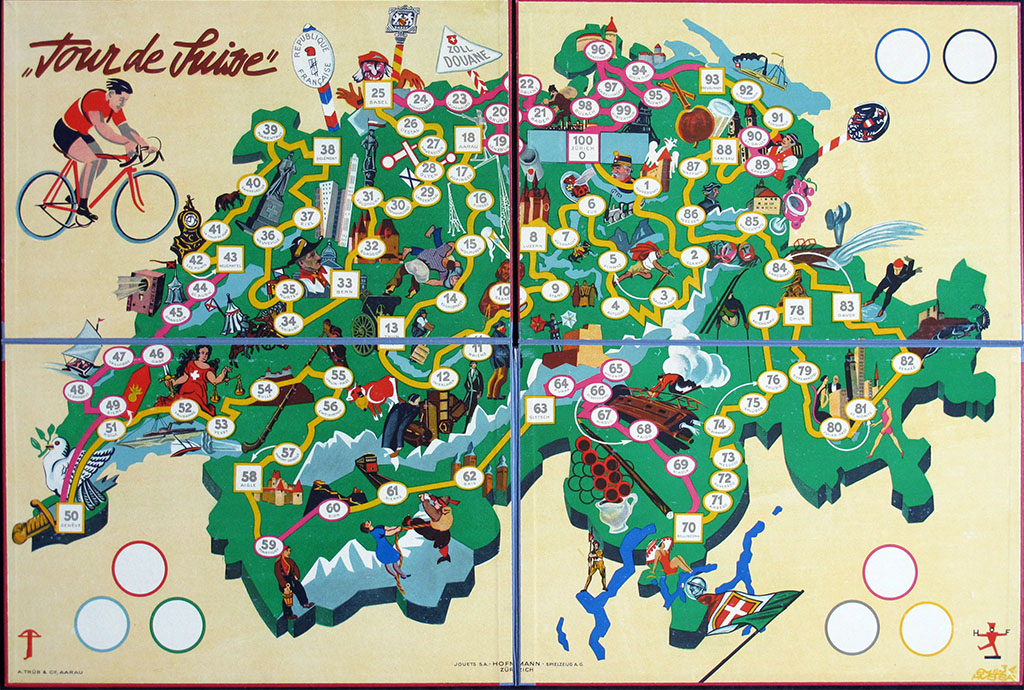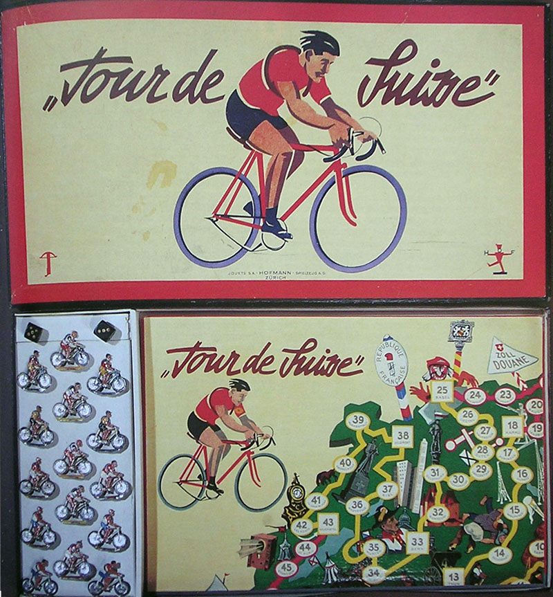 This old Swiss game has proven to be hard to find. It was first mentioned to me almost fifteen years ago by the late Geert Lagrou, who sent me a picture of the game he had found in a book (see below). In these years I have seen the game for sale only a couple of times, until I was lucky enough to stumble on a copy of the game. That was the box you can see on the left of the picture above, and I guess we can call it the poor man's version of the game. And then, just a few months later, I received an email asking if I was interested in buying the box you see on the right, complete with metal riders. Of course I was!