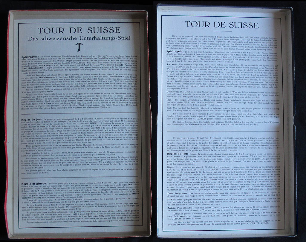 The rules are pasted to the back of the box lid in both cases. What is quite surprising is that they are not the same rules (although they are not too different, of course). The first difference is that the Hofmann version only has rules in German and French, while the other box has Italian rules too. In my opinion this strengthens the thesis that this version might be a reprint.