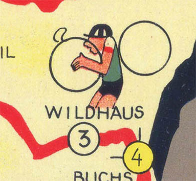 This is a promotional game for a store in Olten. The 1935 edition of the Tour de Suisse had a stage finish in Olten, which was not common (it happened again in 1948, and there we had to wait until the 1970s to find another stage finish in Olten). Having a stage finish in town is a good excuse to make a cycling game, specially if you have a bike shop.