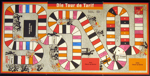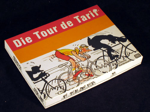 Another game which I would hardly label as a "cycling game". This one was released by the German train company but it is not just a promotional game for a train company based on a cycling race (which is already quite strange). The fact is that apart from the cyclist pictured on the box and the board, I can hardly see where the cycling connection is. (UPDATE: I have seen a picture of this game with cycling figurines, maybe my wooden counters are a replacement)