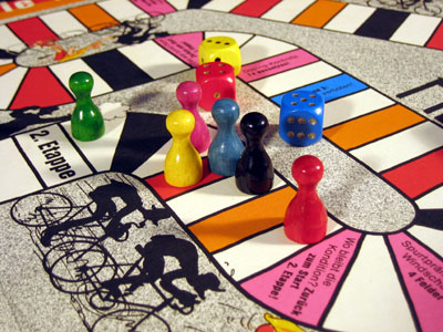 Of course, my understanding of German is quite limited, but not that limited. Basically, the players throw the dice and if they fall on black, orange or red square (and there are lots of these) they take a card and follow the instructions or try to answer the question on the card. The funny thing is that ALL the questions are about the Deutschebahn. (Example: "Was kostet der Mitfahrer-Sparpreis 2. Klasse?" The answer, of course, is "90 DM". Everybody knows that).