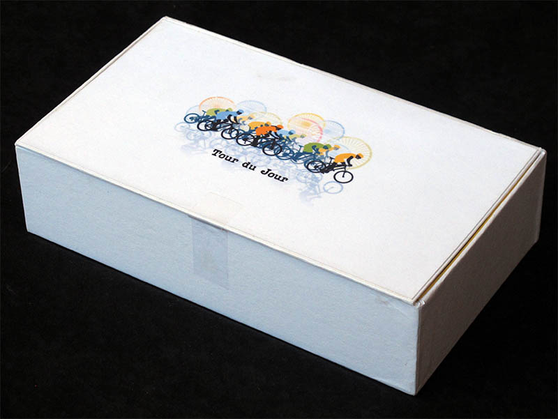 The game comes in a simple white box, with the idea of saving on shipping costs. "Less box, more game", states Ben on his website. For all of us with storage problems, small boxes win some extra points. Inside the box we find a set of cute chipboard squares with which we can build different race courses, plus three longer squares for the special mountain finishes (l'Alpe d'Huez, il Plan di Montecampione and l'Angliru) . We also find 6 teams of 4 racers, a set of 40 cards (many of which are blank) and a 20-sided die and the rules (which can be also downloaded from the games' website).