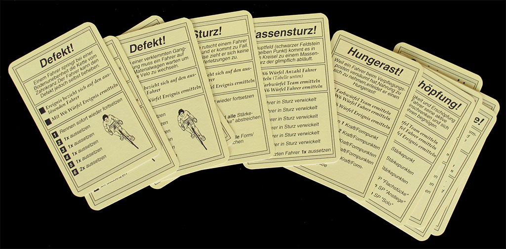 This self-published game is a kind of underground classic. It was first released as "Maillot Jaune" in 1995, and then as "Le Tour" a couple of years later. It was a limited edition of 100 numbered copies (mine is nš 53). It is one of the games that appeals to hardcore gamers since it does not depend on luck, or not too much. The game includes two dice (a regular D6 and a coloured die), but they are used just to determine the result of the race incidents (event cards). The normal development of the race, the movement of the riders, does not depend on luck.