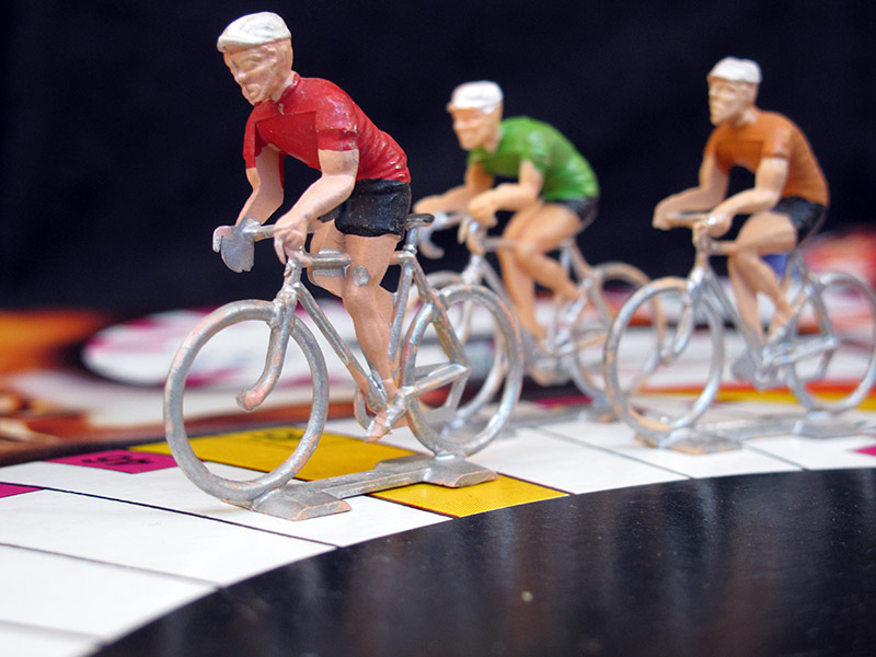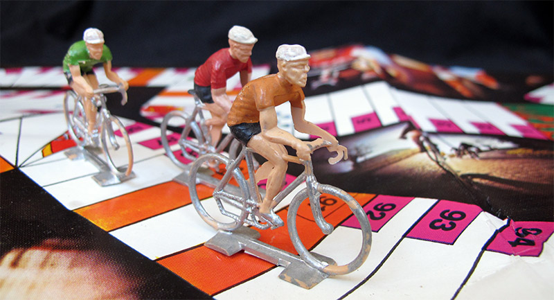 These seven riders are the 70's type smaller Cofalu (as opposed to the bigger later ones, found in games like L'Echappée Infernale or Criterium). As many other (mostly French) games, the seventh rider (the one with the yellow jersey) is included to replace the leader. The game is thus for a maximum of six players.