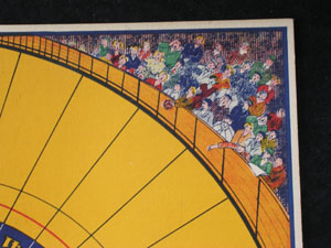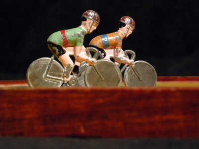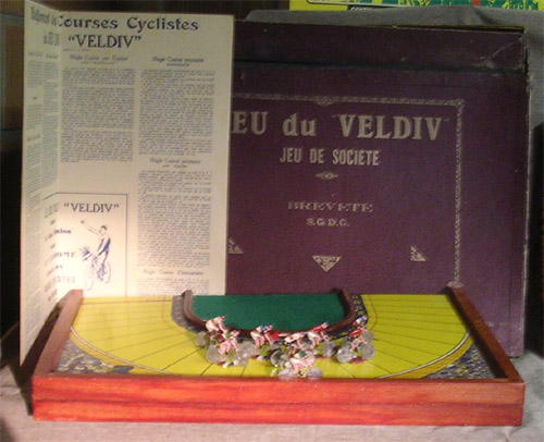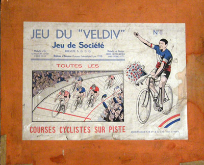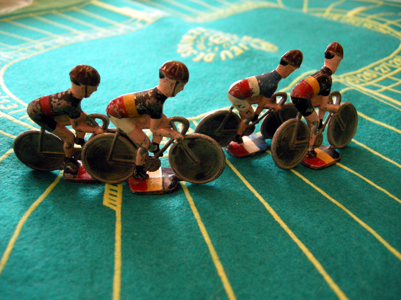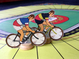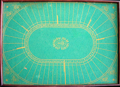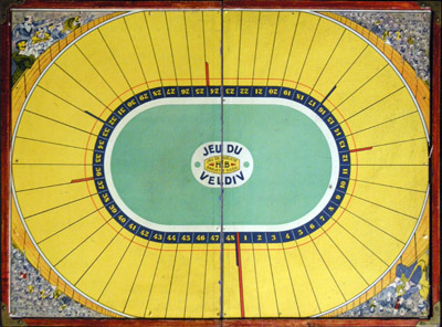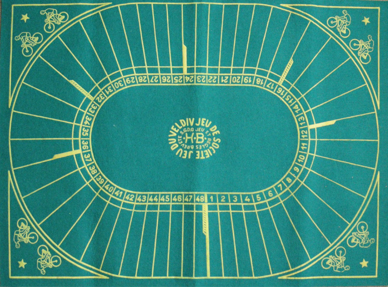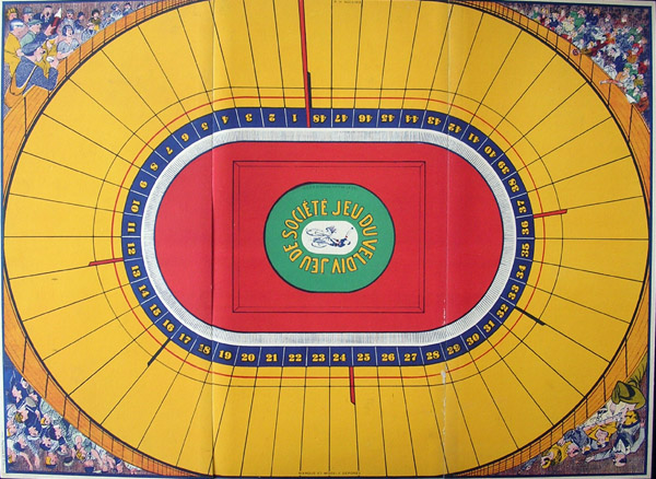 forme ovale, divisée en 48 cases numerotées, de coureurs cyclistes de couleurs