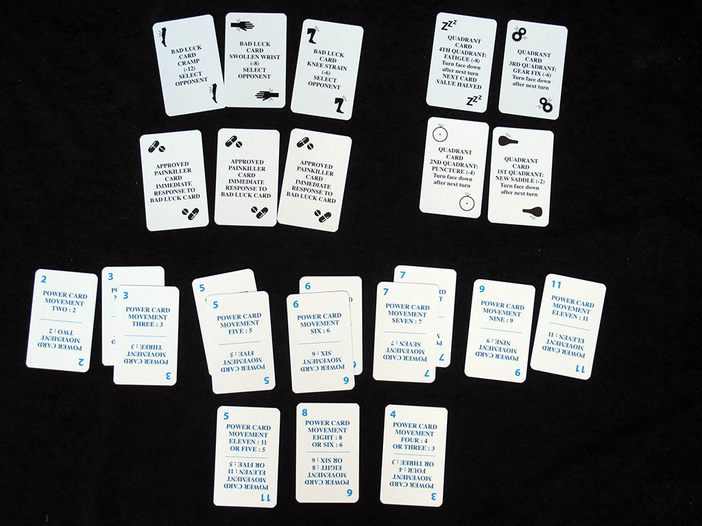 Each player's deck is composed of 24 cards, of which 14 are power cards, 6 are "bad luck" cards to be played on another player, 3 are "approved painkillers" to counter bad luck cards (1000 Bornes-like) and four are "quadrant cards" which have to be played compulsorily one in each quarter of the two-lap long. Three of the eleven power cards have two values. The player can choose whichever seems best.