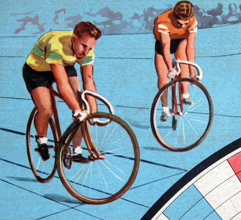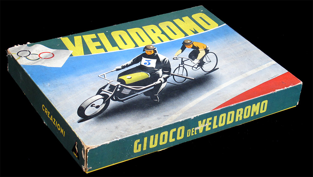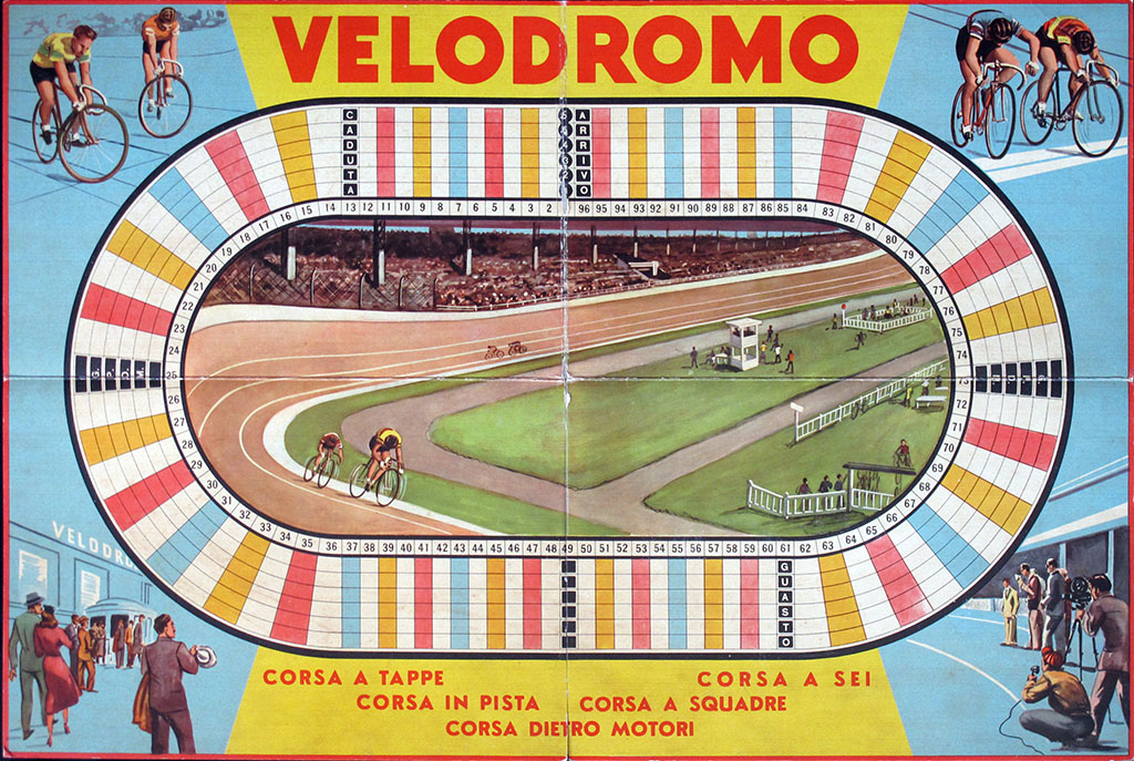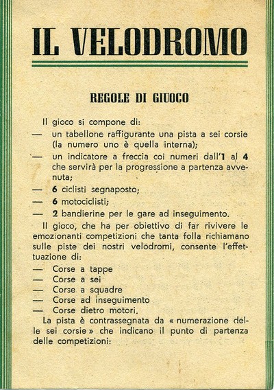 The rules mention five different types of races, one of them being a stage race, in which there is even a "king of the mountains" classification. (You may not see clearly on the picture of the board, but the squares 25 and 73 are marked with the letters "G.P.D.M." which mean "Gran Premio della Montagna"). This special squares, as well as the other two on the board, "Guasto" (breakdown) and "Caduta" (fall), are only used in the stage race. In spite of these stage race rules, I add this game to the velodrome games list.