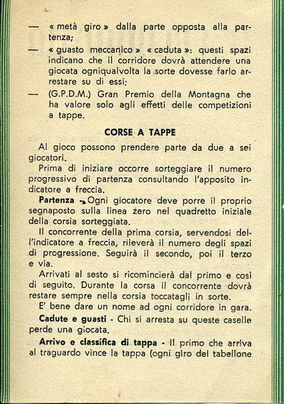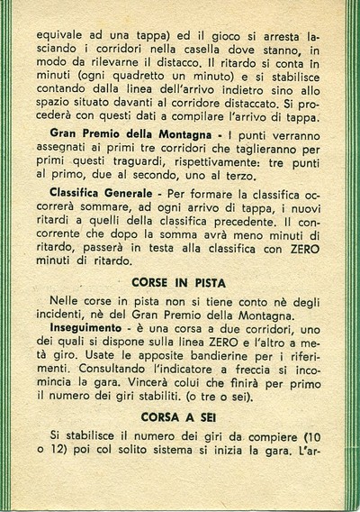 By the way, these are the same rules found on the other version of the game. It is obvious that they do not belong there since the board is quite different. Try, for instance, to play a "corsa a sei" (six rider race) on a board with just for lanes!