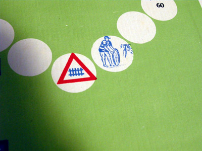 Although the recordings do not change, the two versions of the game have a record with a slightly different label. The one with the red arrow is from the smaller box, while the big box has a record with a yellow arrow (see picture above). By the way, I have discovered that the record included in my big box is misspressed: you can hear four different consecutive winners for each race. I wonder if all the edition has the same mistake (any owner of the game still has a record player?) My record with the red arrow is OK.